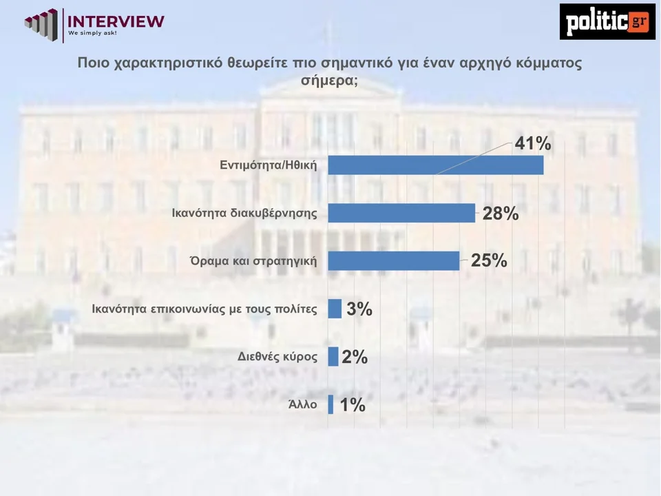 Κυρίαρχο χαρακτηριστικό για τους πολίτες παραμένει η «εντιμότητα και ηθική» (41%). Ακολουθούν η «ικανότητα διακυβέρνησης» (28%) και το «όραμα και στρατηγική» (25%). Στα χαμηλότερα ποσοστά βρίσκονται η «ικανότητα επικοινωνίας με τους πολίτες» (3%) και το «διεθνές κύρος» (2%).