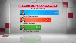 Στην ερώτηση για τον καταλληλότερο για πρωθυπουργό, οι πολίτες που ρωτήθηκαν στο πλαίσιο της δημοσκόπησης της MARC, απάντησαν σε ποσοστό 30,6% ότι είναι ο Κυριάκος Μητσοτάκης. Το 8.5% στηρίζει την Ζωή Κωνσταντοπούλου ενώ το 7,3% τον Νίκο Ανδρουλάκη.