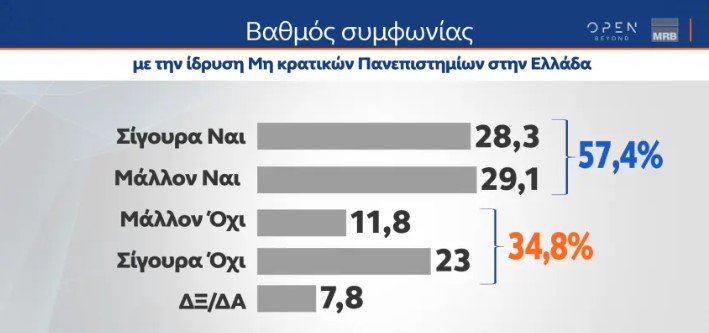 Υπέρ των ξένων πανεπιστημίων στην Ελλάδα δηλώνει το 57,4%, σύμφωνα με το β΄ μέρος της δημοσκόπησης της MRB που παρουσιάστηκε στο κεντρικό δελτίο του Open.