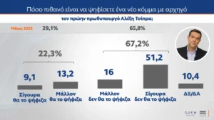 Όσον αφορά το ενδεχόμενο νέου κόμματος από τον Αλέξη Τσίπρα και τον Αντώνη Σαμαρά οι πολίτες θα τα ψήφιζαν σε ποσοστό 22,3% και 14,1% αντίστοιχα.