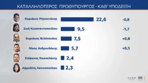 Στο ερώτημα για το καταλληλότερος πρωθυπουργός ο Κυριάκος Μητσοτάκης προηγείται με 22,6% και ακολουθούν η Ζωή Κωνσταντοπούλου με 9,5%, ο Κυριάκος Βελόπουλος με 7,5%, ο Νίκος Ανδρουλάκης με 5,7%, ο Στέφανος Κασσελάκης με 2,4% και η Αφροδίτη Λατινοπούλου με 2,3%