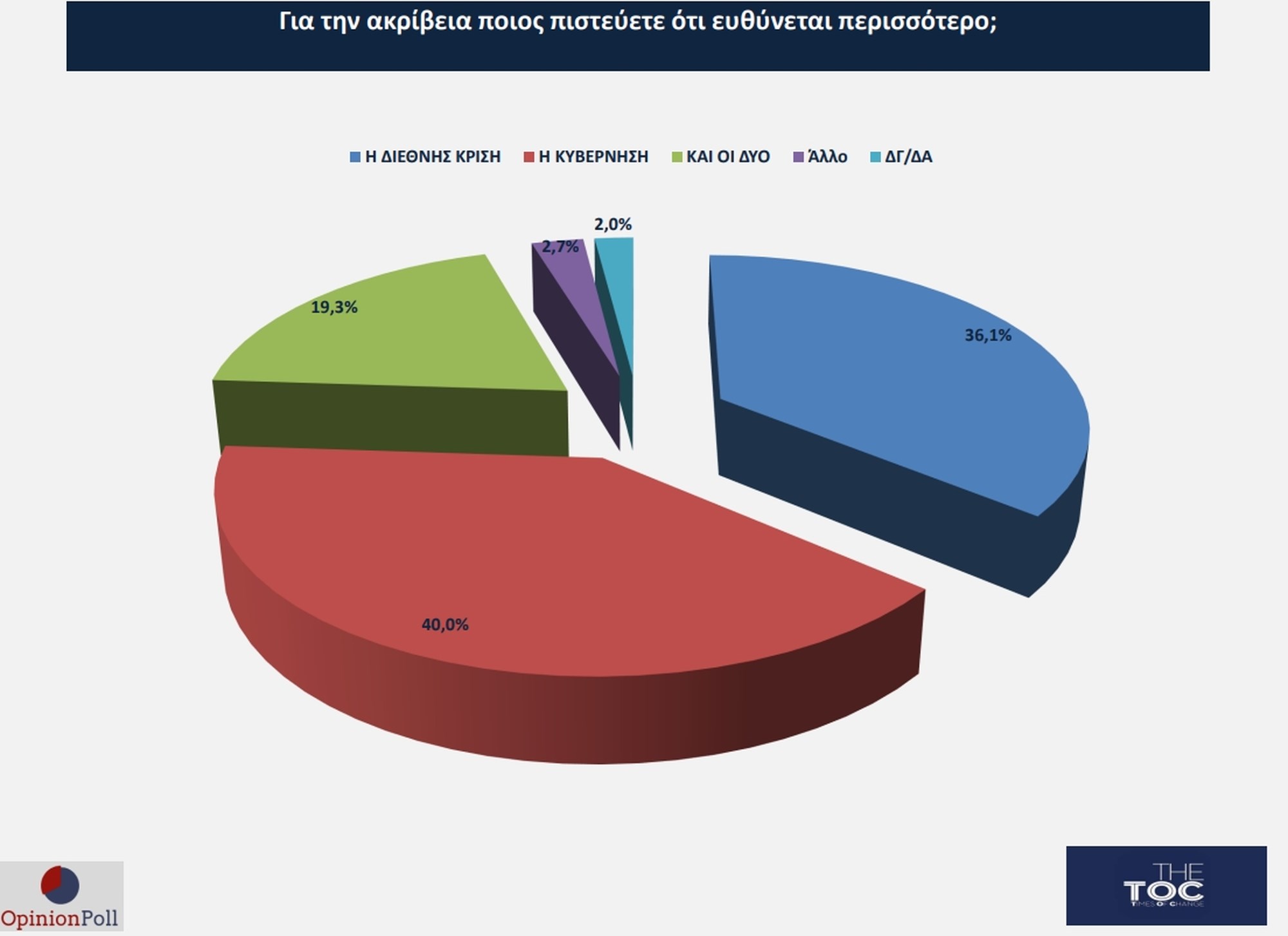 Από την μια, το 36.1% θεωρεί ότι περισσότερο ευθύνεται η διεθνής συγκυρία, το 40% τα βάζει με την Κυβέρνηση και το 19.3% θεωρεί ότι ευθύνονται και οι δύο αυτοί παράγοντες.
