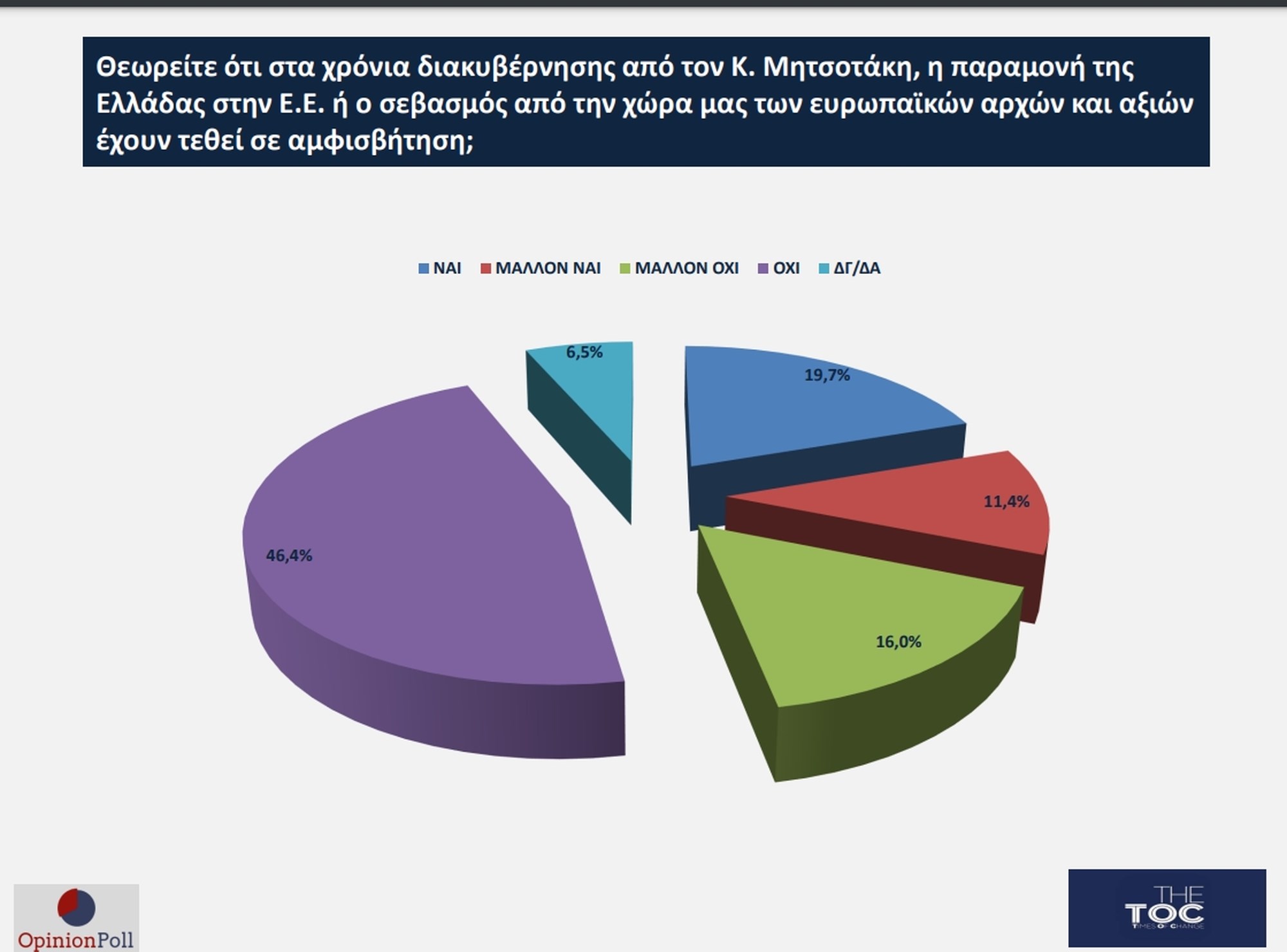 Οσον αφορά τέλος τον σεβασμό από την χώρα μας των ευρωπαϊκών αρχών και αξιών, θέμα που είναι στην κορυφή της ατζέντας του ΣΥΡΙΖΑ, με αφορμή το σκάνδαλο των υποκλοπών, το 31.1% θεωρεί έχουν τεθεί σε αμφισβήτηση επί διακυβέρνησης Κ. Μητσοτάκη. Ωστόσο, 62.4% έχει αντίθετη άποψη.