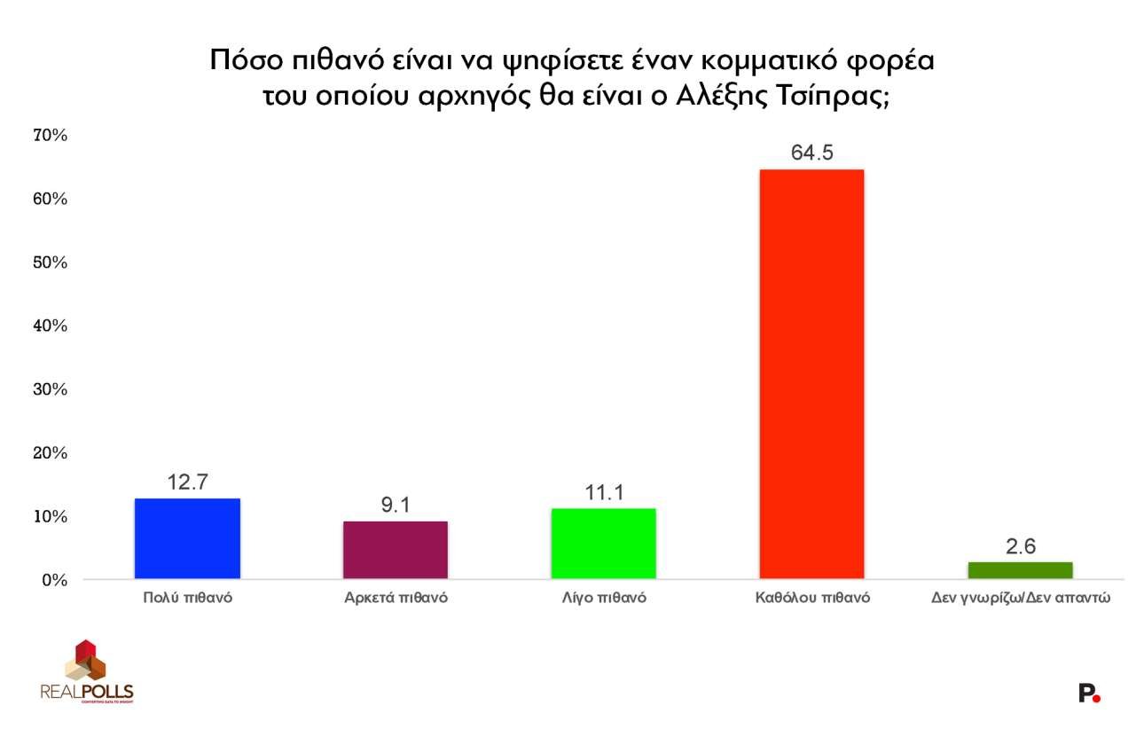 Σύμφωνα με την έρευνα, το 12,7% δηλώνει ότι είναι «πολύ πιθανό» να ψήφιζε κόμμα με επικεφαλής τον Αλέξη Τσίπρα και το 9,1% «αρκετά πιθανό», ενώ το 64,5% απορρίπτει κατηγορηματικά αυτό το ενδεχόμενο. Αντίθετα, μόλις το 3,2% θεωρεί «πολύ πιθανό» να στήριζε κόμμα υπό τον Αντώνη Σαμαρά, με το 72,6% να απαντά «καθόλου πιθανό».