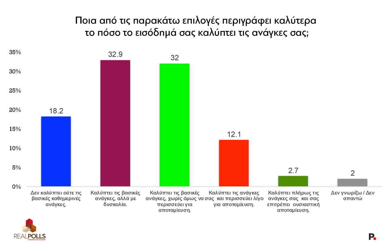 Η έρευνα αποτυπώνει έντονη κοινωνική πίεση: το 18,2% δηλώνει ότι το εισόδημά του δεν καλύπτει ούτε τις βασικές ανάγκες, ένας στους δύο πολίτες τα βγάζει δύσκολα πέρα, ενώ το 63,1% δεν μπορεί να αποταμιεύσει. Επιπλέον, το 36,6% ανέφερε ότι δεν πήγε διακοπές λόγω οικονομικών δυσκολιών.