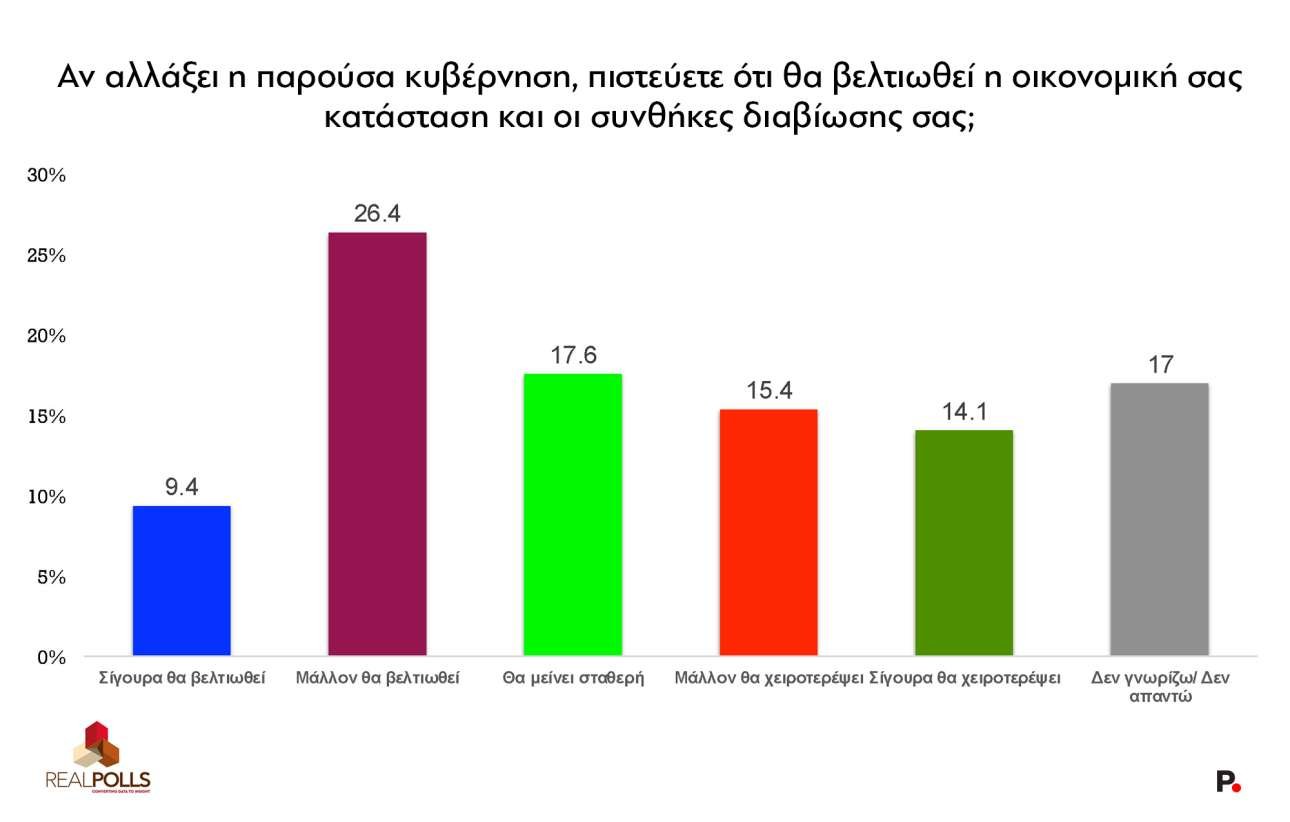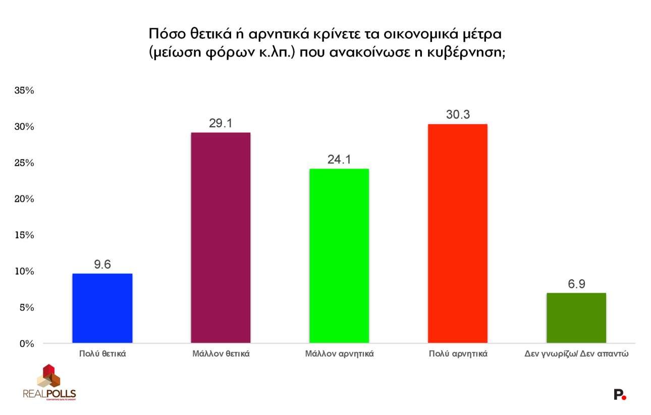 Παρά το γεγονός ότι το 38,7% κρίνει θετικά ή μάλλον θετικά τα μέτρα που ανακοίνωσε ο Πρωθυπουργός στη ΔΕΘ, μόνο το 22,8% πιστεύει ότι αυτά θα βελτιώσουν την καθημερινότητά του. Αντίθετα, σχεδόν οι μισοί (47%) εκτιμούν ότι η κατάσταση θα παραμείνει στάσιμη ή και θα χειροτερέψει.