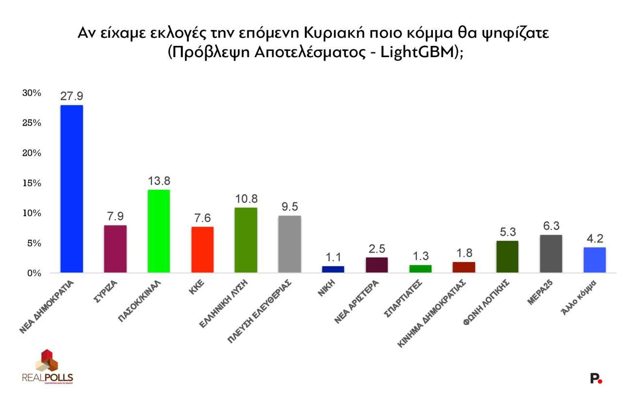 Στην εκτίμηση ψήφου, η ΝΔ συγκεντρώνει 27,9%, το ΠΑΣΟΚ-ΚΙΝΑΛ 13,8%, η Ελληνική Λύση 10,8% και η Πλεύση Ελευθερίας 9,5%. Ο ΣΥΡΙΖΑ ανεβαίνει στο 7,9%, το ΚΚΕ στο 7,6% και το ΜέΡΑ25 στο 6,3%, ενώ η Φωνή της Λογικής μετράται στο 5,3%.