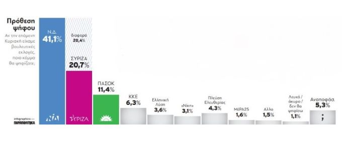 Στην πρόθεση ψήφου η Νέα Δημοκρατία καταγράφεται στο 41,1%. Ακολουθεί ο ΣΥΡΙΖΑ με 20,7%. Το ΠΑΣΟΚ βρίσκεται στο 11,4% και το ΚΚΕ στο 6,3%. Η Πλεύση Ελευθερίας εμφανίζεται πέμπτο κόμμα με 4,3%, η Ελληνική Λύση ακολουθεί με 3,6% και η Νίκη 3,1%. Τέλος το ΜέΡΑ25 εμφανίζεται μόλις στο 1,6%.