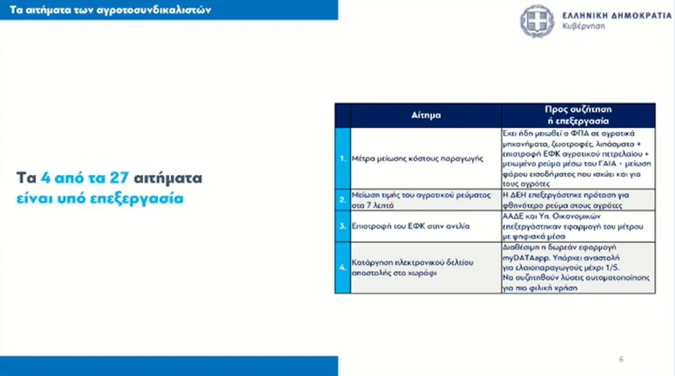 Σε άλλο σημείο της συνέντευξης Τύπου ο αντιπρόεδρος της κυβέρνησης τόνισε ότι από τα 27 αιτήματα των αγροτών έχουν ικανοποιηθεί τα 16, ενώ τέσσερα βρίσκονται υπό επεξεργασία, και σημείωσε πως 7 από τα αιτήματα των αγροτών είναι εκτός δημοσιονομικού ορίου και πλαισίου της ΕΕ.