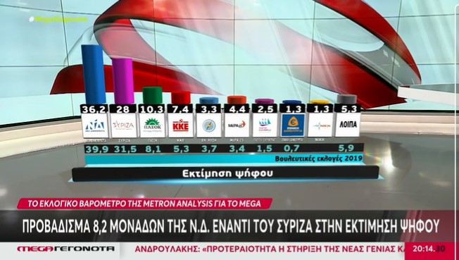 Μπροστά με 7 μονάδες- 8,2% στην εκτίμηση ψήφου- έχει περάσει η Νέα Δημοκρατία τον ΣΥΡΙΖΑ, όπως δείχνει νέα δημοσκόπηση της Metron Analysis και του Mega.