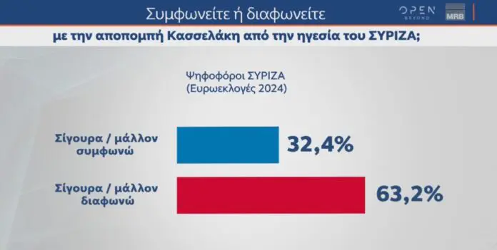 Στη δημοσκόπηση της MRB που παρουσιάστηκε απόψε για λογαριασμό του OPEN, αναφορικά με τον ΣΥΡΙΖΑ, το 63,2% των ψηφοφόρων του κόμματος στις ευρωεκλογές διαφωνεί με την αποπομπή του Στέφανου Κασσελάκη από την ηγεσία του κόμματος, ενώ το 32,4% συμφωνεί.