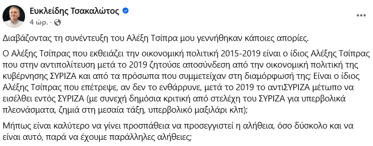 Ο Ευκλείδης Τσακαλώτος, το μεσημέρι της Παρασκευής 22/8 είχε επισημάνει τα εξής κατά του Αλέξη Τσίπρα σε ανάρτηση του στα social media: