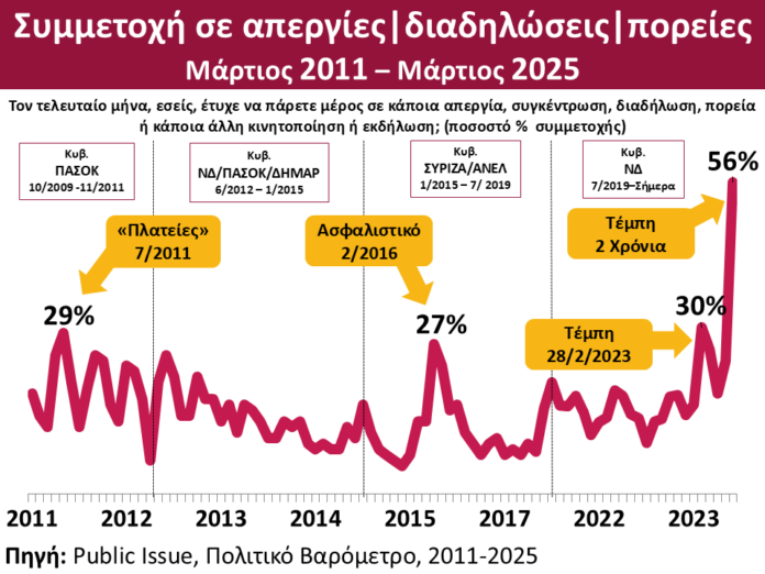 Περισσότεροι από τους μισούς πολίτες, συγκεκριμένα το 56% των ατόμων ηλικίας 17 ετών και άνω, έλαβαν μέρος στις πρόσφατες κινητοποιήσεις για την τραγωδία των Τεμπών στην Ελλάδα.