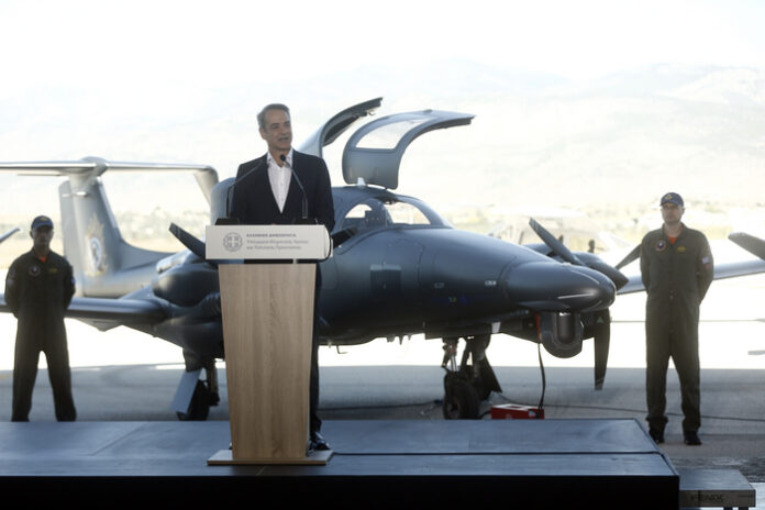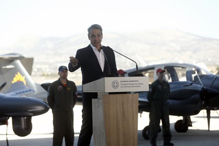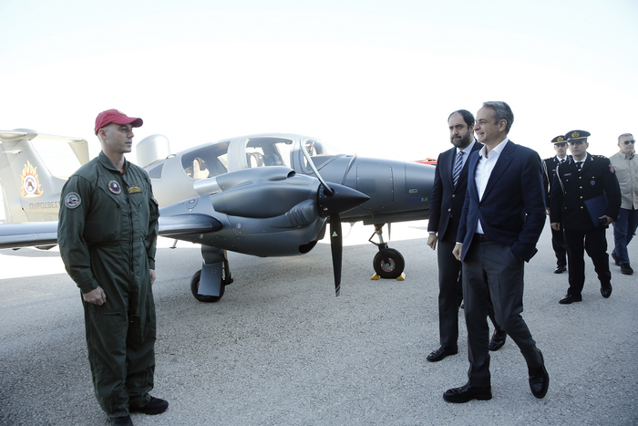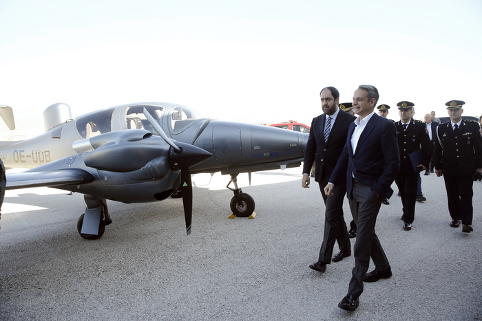 «Με πολύ μεγάλη χαρά υποδεχόμαστε σήμερα τα πρώτα ιδιόκτητα αεροσκάφη στην ιστορία του Πυροσβεστικού Σώματος», ανέφερε ο πρωθυπουργός Κυριάκος Μητσοτάκης μιλώντας στην εκδήλωση του υπουργείου Κλιματικής Κρίσης και Πολιτικής Προστασίας για την παραλαβή τριών αεροσκαφών Diamond DA62 MPP του Πυροσβεστικού Σώματος, στο Αεροδρόμιο Μεγάρων.