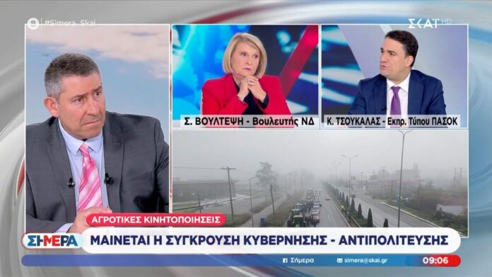 Απαντώντας στην παριστάμενη στο τηλεοπτικό πάνελ βουλευτή της Νέας Δημοκρατίας, Σοφία Βούλτεψη, που ισχυρίστηκε ότι η εκάστοτε αντιπολίτευση «λαϊκίζει» με τους αγρότες, σημείωσε: «Ξεχάσατε που ο κ. Μητσοτάκης έβαζε τους αγρότες να κάθονται πάνω σε μπάλες από σανό για να γυρίζει διαφημιστικά σποτ; Και μετά μοίραζε σανό στους πολίτες».