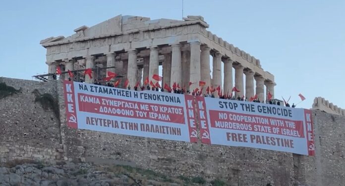 Πανό υπέρ της Παλαιστίνης ανήρτησαν μέλη του ΚΚΕ, στην Ακρόπολη, νωρίς το πρωί της Παρασκευής.