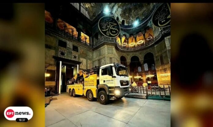 Φωτογραφίες και βίντεο που δείχνουν μεγάλα φορτηγά, τα οποία ζυγίζουν μέχρι και 45 τόνους, να κινούνται μέσα στην Αγία Σοφία, προκαλούν προβληματισμό για την στατικότητα του μνημείου.
